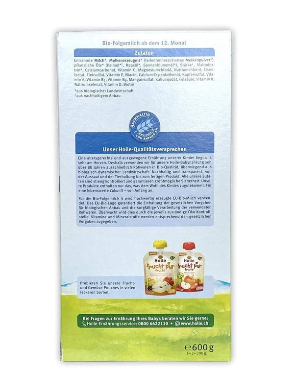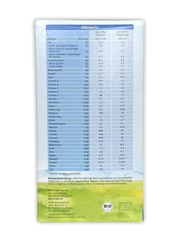 Why we love Holle Stage Three Great for babies from 10 months + No added sugar Essential Vitamins and Minerals Calcium for healthy bones No wheat, soy, or peanut ingredients Free from artificial chemicals, preservatives, and flavors Biodynamic, Demeter, and Organic Certified (Organic ++) Chemical-free farming and positive animal husbandry Gluten-Free Iron fortified Main carbohydrate is lactose GMO-Free 600g / 21oz of formula powder.